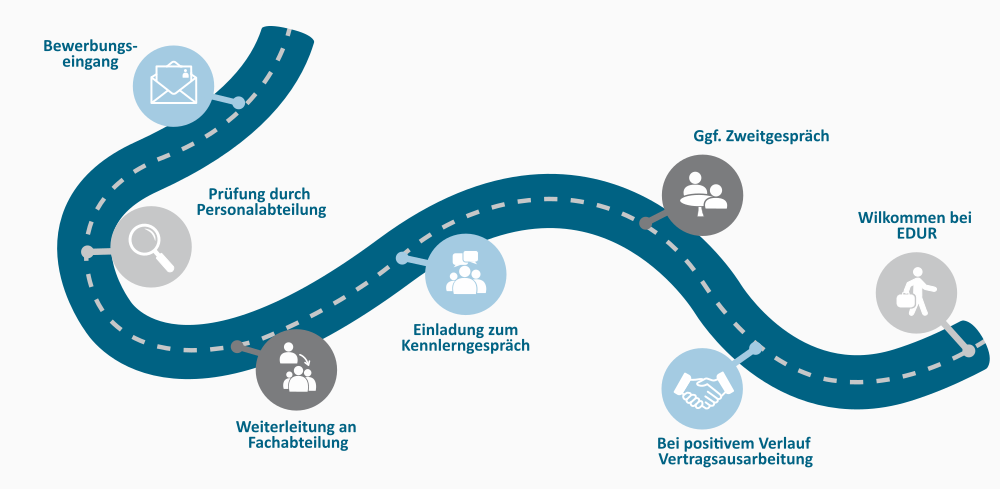 Eine Ausschreibung hat dein Interesse geweckt und du möchtest dich bei uns bewerben? Großartig! Nach Zusendung deiner Bewerbungsunterlagen (gerne per Mail oder über unser Bewerbungsformular) bekommst du eine Eingangsbestätigung von unserer Personalabteilung. Diese prüft dann deine Unterlagen und leitet sie an die relevante Fachabteilung weiter. Bei positiver Rückmeldung erhältst du eine Einladung zum Kennlerngespräch, gegebenenfalls folgt noch ein Zweitgespräch. Wenn die Gespräche positiv verlaufen und beide Seiten grünes Licht geben, steht der Vertragsausarbeitung nichts mehr im Weg und wir heißen dich zum abgestimmten Zeitpunkt bei EDUR herzlich willkommen!