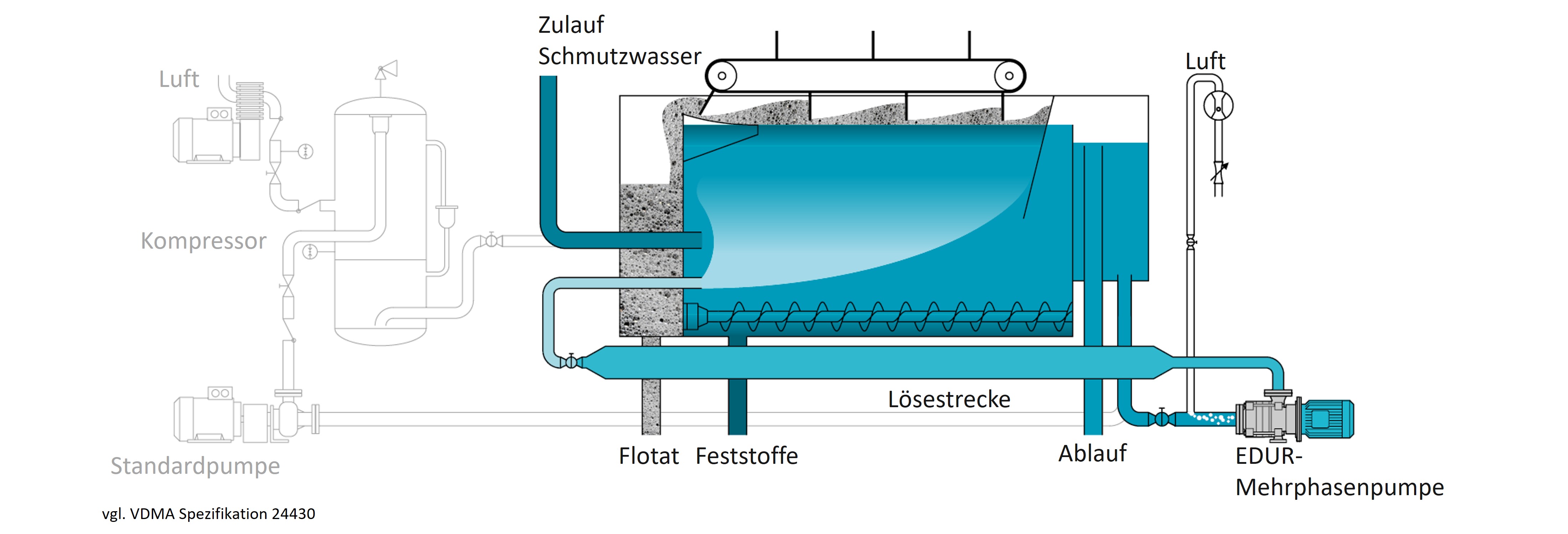 Die Druckentspannungsflotation (DAF) ist eine bewährte Technik zur industriellen Abwasserbehandlung. Dabei werden Feststoffe mithilfe von Mikroblasen an die Wasseroberfläche gefördert und können dort abgeschöpft werden. Diese Mikroblasen werden erzeugt, indem zuvor durch Druck in Wasser gelöstes Gas durch Entspannung wieder ausgast. Häufig werden nach wie vor „konventionelle“ Anlagen verwendet, in denen Kompressor und Druckkessel zum Einsatz kommen. EDUR liefert hier bewährt durch den Einsatz von Mehrphasenpumpen eine Alternative. Sie können Gas direkt über die Saugleitung der Pumpe in das Fördermedium einspeisen, wodurch im Vergleich zu Systemen nach konventioneller Bauart Anlagenkomponenten wie Kompressor, Druckkessel, aufwändige Steuerung und diverse Ventile nicht mehr benötigt werden. In der Folge lassen sich signifikante Einsparmöglichkeiten – unter anderem auch des Energieverbrauchs – durch ein Umrüsten auf das EDUR-System realisieren.